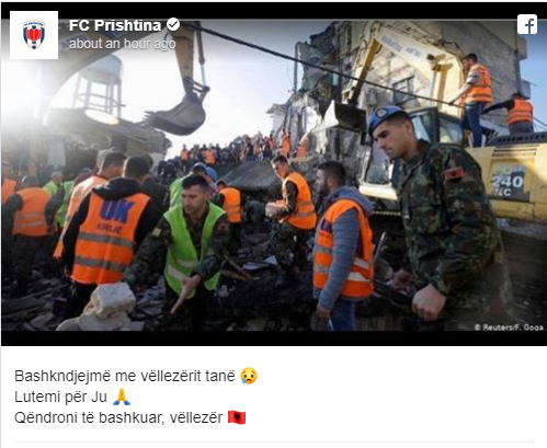 “Lutemi për familjet e prekura nga tërmeti. Me mendje e me zemër pranë vëllëzerve dhe motrave tona”, shkruhet në profilin e KB Prishtinës.