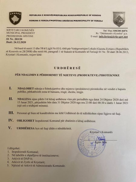 Me urdhëresën e nxjerr nga Kryetari i Komunës së Ferizajt, Agim Aliu, nga dita e sotme e deri më 15 Janar 2021, ndalohet përdorimi i mjeteve piroteknike në vende të hapura publike, përkatësisht në zona të banuara, rrugë, sheshe, tregje.