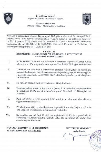 “Çështja e lokacionit për vendosjen e shtatores së Anton Çettës është e zgjidhur me vendimin e KK të Prishtinës (12.11.2020). Në një vend shumë dinjitoz, i përcaktuar në bashkëpunim edhe me familjen e tij”, ka shkruar kryesuesi i Kuvendit Komunal të Prishtinës, Agim Kuleta, në Facebook