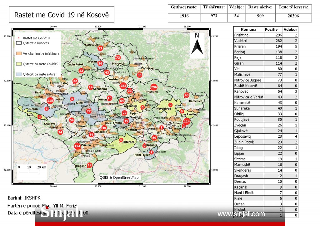 Sipas hartës së publikuar nga Ministria e Shëndetësisë, që nga fillimi i pandemisë janë testuar 20 mijë e 206 raste.