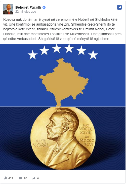 “Kosova nuk do të marrë pjesë në ceremoninë e Nobelit në Stokholm këtë vit. Unë konfirmoj se ambasadorja ynë Znj. Shkendije-Geci-Sherifi do të bojkotojë këtë event, shkaku i fituesit kontravers të Çmimit Nobel, Peter Handke, mik dhe mbështetës i politikës së Millosheviqit. Unë gjithashtu pres që edhe Ambasadori i Shqipërisë të veprojë në mënyrë të ngjashme”, ka shkruar Pacolli.