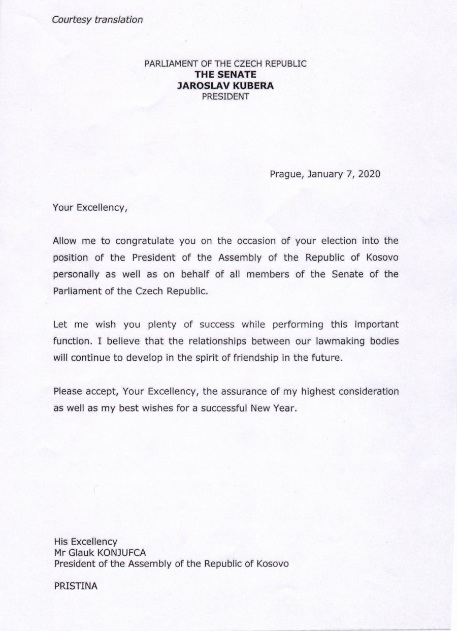 “Shkëlqesia juaj, më lejoni t’ju përgëzoj me rastin e zgjedhjes tuaj në postin e kryetarit të Kuvendit të Republikës së Kosovës, personalisht, si dhe në emër të të gjithë anëtarëve të Senatit të Parlamentit të Republikës Çeke. Më lejoni t’ju uroj shumë suksese gjatë kryerjes së këtij funksioni të rëndësishëm. Unë besoj se marrëdhëniet midis organeve tona ligjvënëse do të vazhdojnë të zhvillohen në frymë miqësore në të ardhmen. Ju lutem, Shkëlqesia juaj, pranoni konsideratën time më të lartë për ju, si dhe urimet më të mira për një Vit të Ri të suksesshëm”, thuhet në telegramin e urimit të kryesenatorit çek, Jaroslav Kubera.
