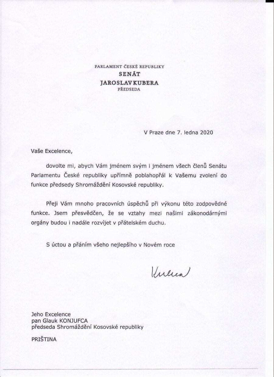 Kryetari i Senatit të Parlamentit të Republikës Çeke, Jaroslav Kubera, nëpërmjet një telegrami, ka uruar kryetarin e Kuvendit të Republikës së Kosovës, Glauk Konjufca, me rastin e zgjedhjes së tij në këtë detyrë.