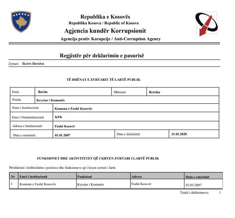 Kryetari i Fushë Kosovës, Burim Berisha, ka deklaruar pasurinë e tij.