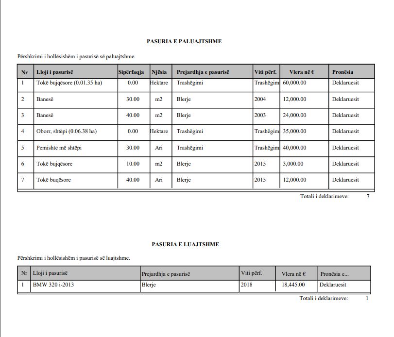 Berisha ka bërë të ditur se ka të blera dy banesa si dhe tokë bujqësore, ndërkaq një shtëpi me oborr e ka të trashëguar po ashtu edhe një shtëpi me pemishte e ka të trashëguar.