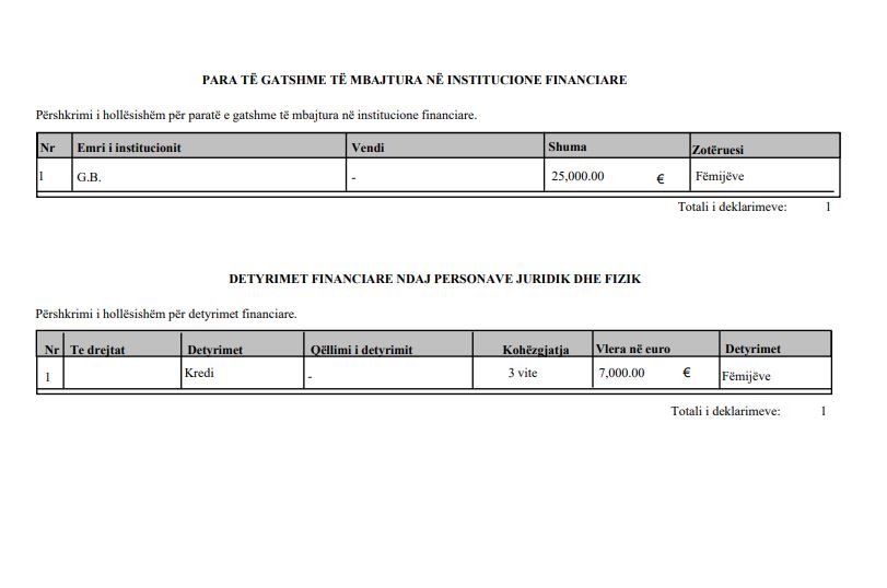 Sa i përket parave të gatshme në institucione financiare, Berisha ka deklaruar se fëmijët e tij kanë 25 mijë euro. Po ashtu fëmijët e tij kanë edhe 7 mijë euro kredi.