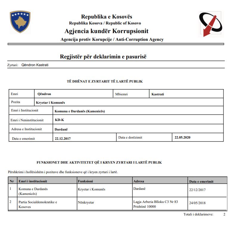 Kryetari i Komunës së Kamenicës, Qëndron Kastrati ka deklaruar pasurinë e tij në Agjencinë Kundër Korrupsionit (AKK).