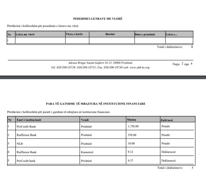 Sipas formularit të publikuar nga AKK-ja, Qëndron Kastrati në institucione financiare ka vetëm 13.49 euro para të gatshme dhe krahasuar me vitin e kaluar, Kastrati ka 22.35 euro më pak (35.84 euro të gatshme në bankë vitin e kaluar).
