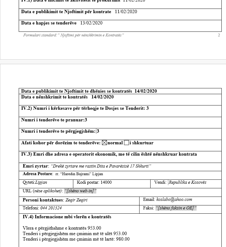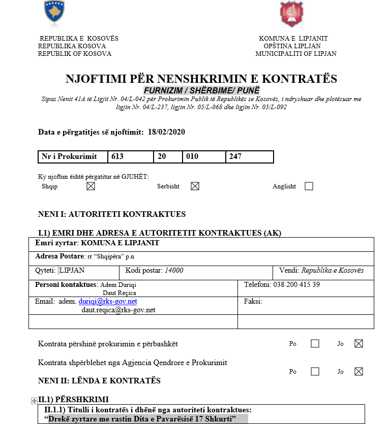 Njoftimi për nënshkrim të Kontratës për këtë drekë është bërë i ditur në ueb faqen e Komisionit Rregullativ të Prokurimit Publik (KRRPP).