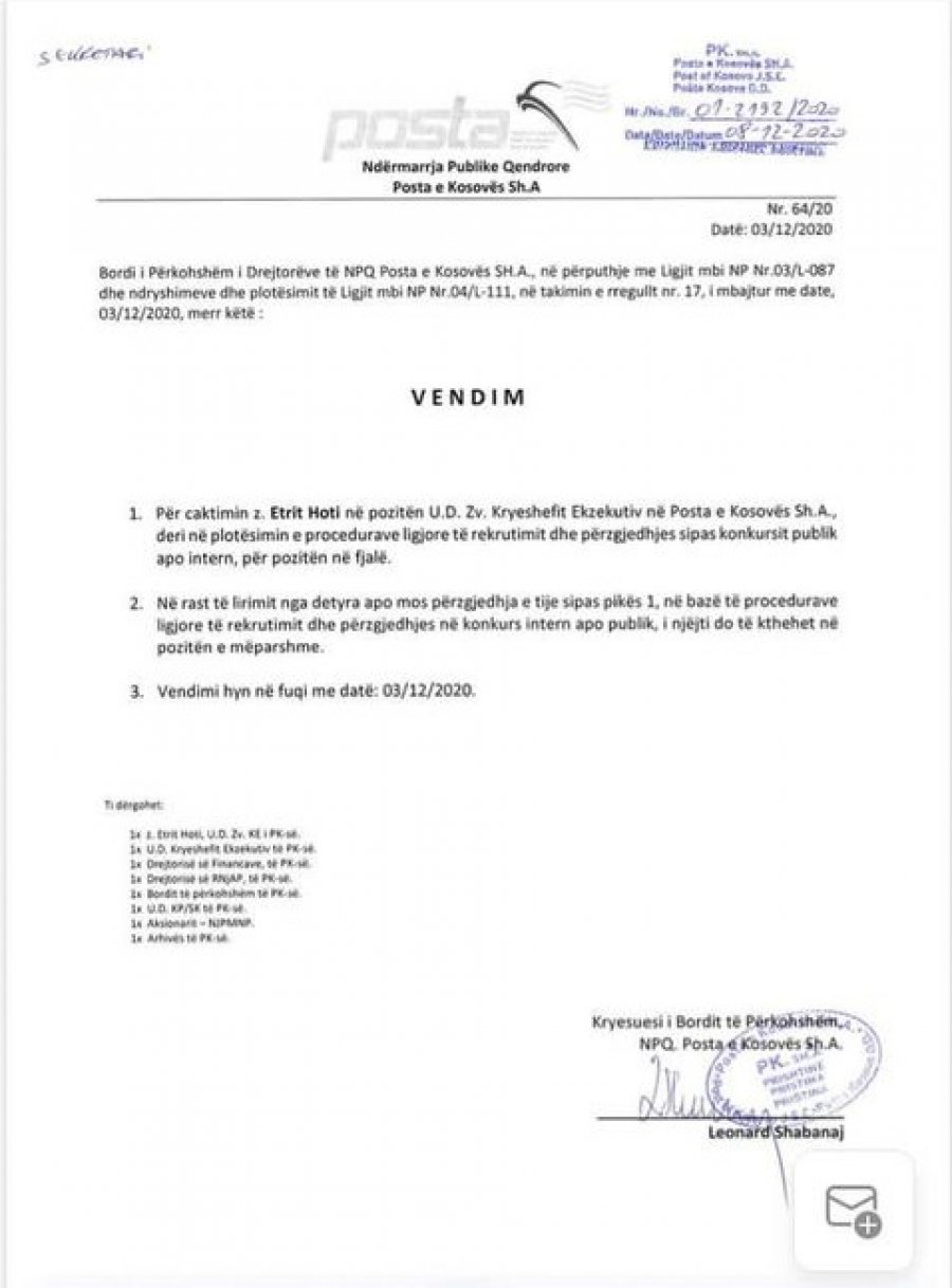 “Për caktimin e z. Etrit Hoti në pozitën e U.D Zv. Kryeshefit Ekzekutiv në Posta e Kosovës Sh.A. deri në plotësimin e procedurave ligjore të rekrutimit dhe përzgjedhjen sipas konklursit publik apo intern, për pozitën në fjalë”, thuhet në pikën e parë të këtij vendimi.