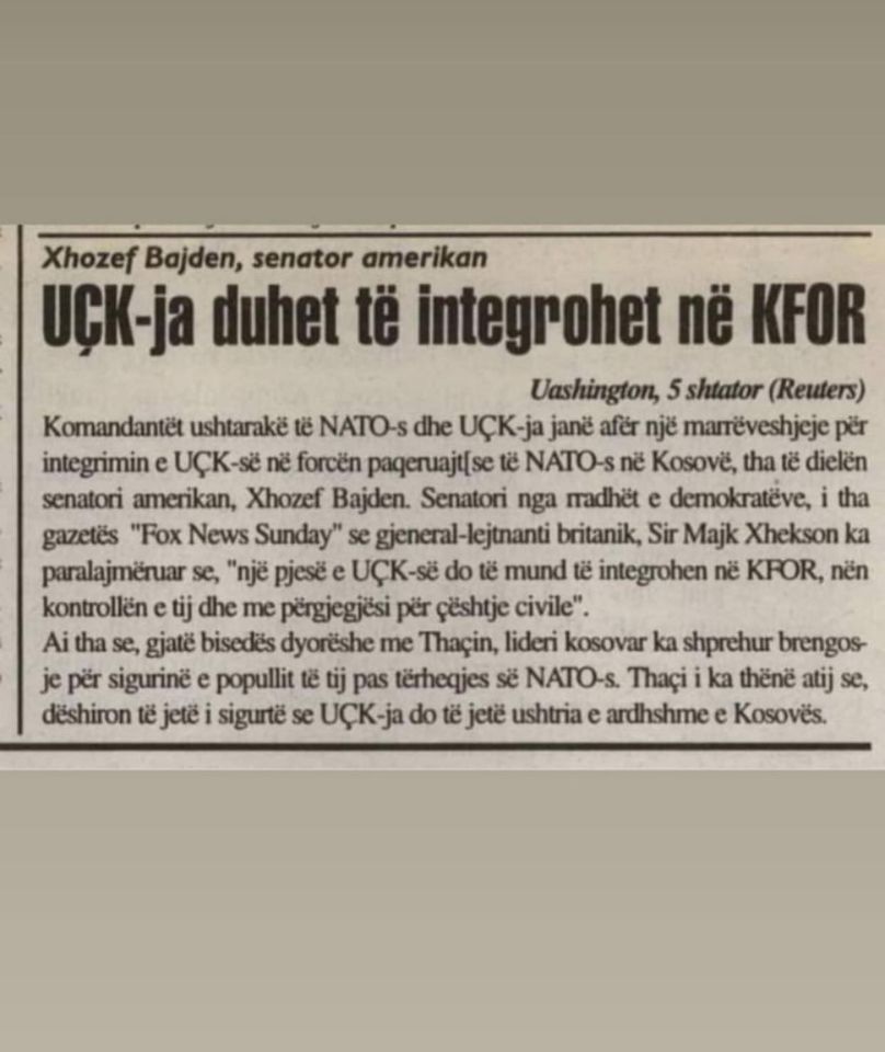Aso kohe, Biden ishte senator i SHBA-ve.“Ne vitin 1999 nje Senator amerikan kishte propozuar qe UÇK te integrohej ne strukturen e KFOR-it. Besimi i ShBA-ve per çlirimtaret tane ka qene ne kete nivel. Ky Senator ishte Joe Biden!”, ka shkruajtur Bytyqi.