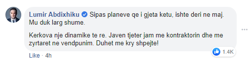 “Sipas planeve që i gjeta këtu, ishte deri ne maj. Mu duk larg shume. Kërkova një dinamike te re. Javën tjetër jam me kontraktorin dhe me zyrtaret ne vendpunim. Duhet të përfundoj më shpejtë!”, ka shkruar ministri.