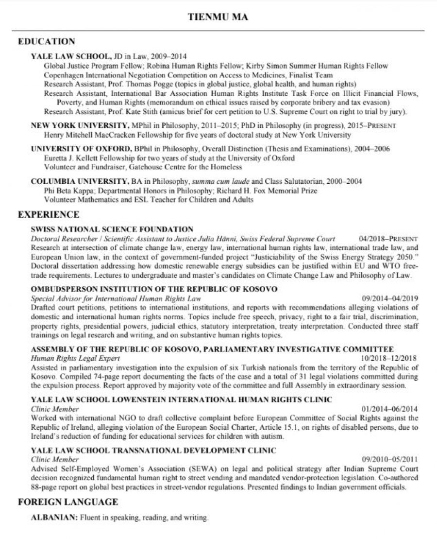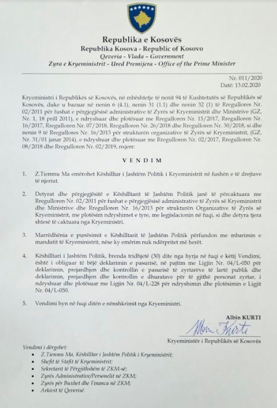 Kryeministri i Republikës së Kosovës, Albin Kurti, ka emëruar sot shtetasin amerikan, Tienmu Ma, këshilltar të jashtëm politik i Kryeministrit në fushën e të drejtave të njeriut, bëhet e ditur përmes një komunikate për media.