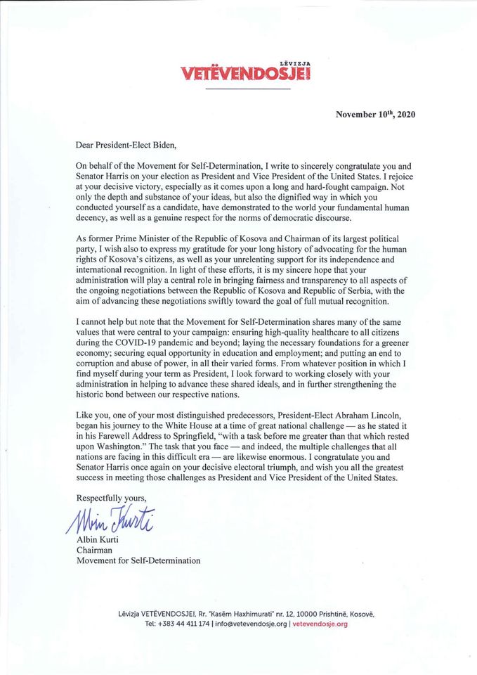 Përmes kësaj letre, Kurti i ka uruar në emër të Vetëvendosjes Biden dhe Senatoren Harris për zgjedhjen si President dhe Zëvendës Presidente e Shteteve të Bashkuara.