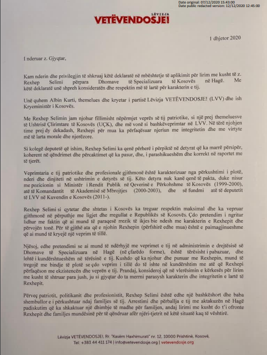 “Me Rexhep Selimin jam njohur fillimisht nëpërmjet veprës së tij patriotike si një prej themeluesve të Ushtrisë Çlirimtare të Kosovës dhe më vonë si bashkëveprimtar në VV. Në tërë njohjen time prej dy dekadash, Rexhepi ka përfaqësuar për mua njeriun me integritet dhe me virtyte të larta morale dhe njerzore”, thuhet në pjesën e parë të letrës që Kurti ia ka dorëzuar Guillous.