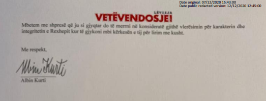 “Mbetem me shpresë që ju si gjyqtar do të merrni në konsideratë gjithë vlerësimin për karakterin dhe integritetin e Rexhepit kur të gjykoni mbi kërkesën e tij për lirim me kusht”, thuhet në letrën e Kurtit.