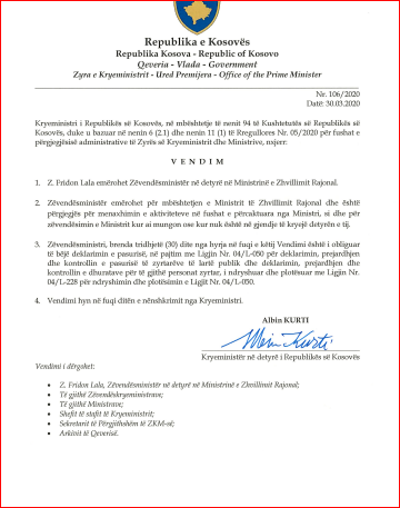 Kryeministri në detyrë i Republikës së Kosovës, Albin Kurti, ka emëruar sot Fridon Lalën, zëvendësministër në detyrë në Ministrinë e Zhvillimit Rajonal.