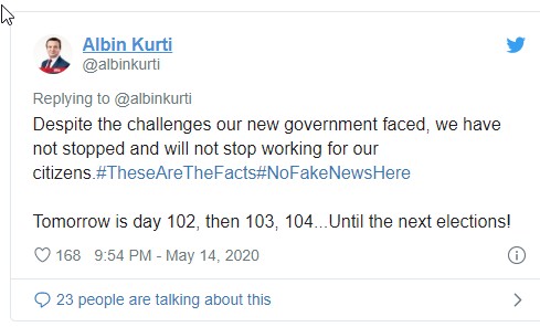 “Nesër është dita e 102, pastaj 103,104… deri në zgjedhjet e ardhshme”, ka shkruar Kurti.