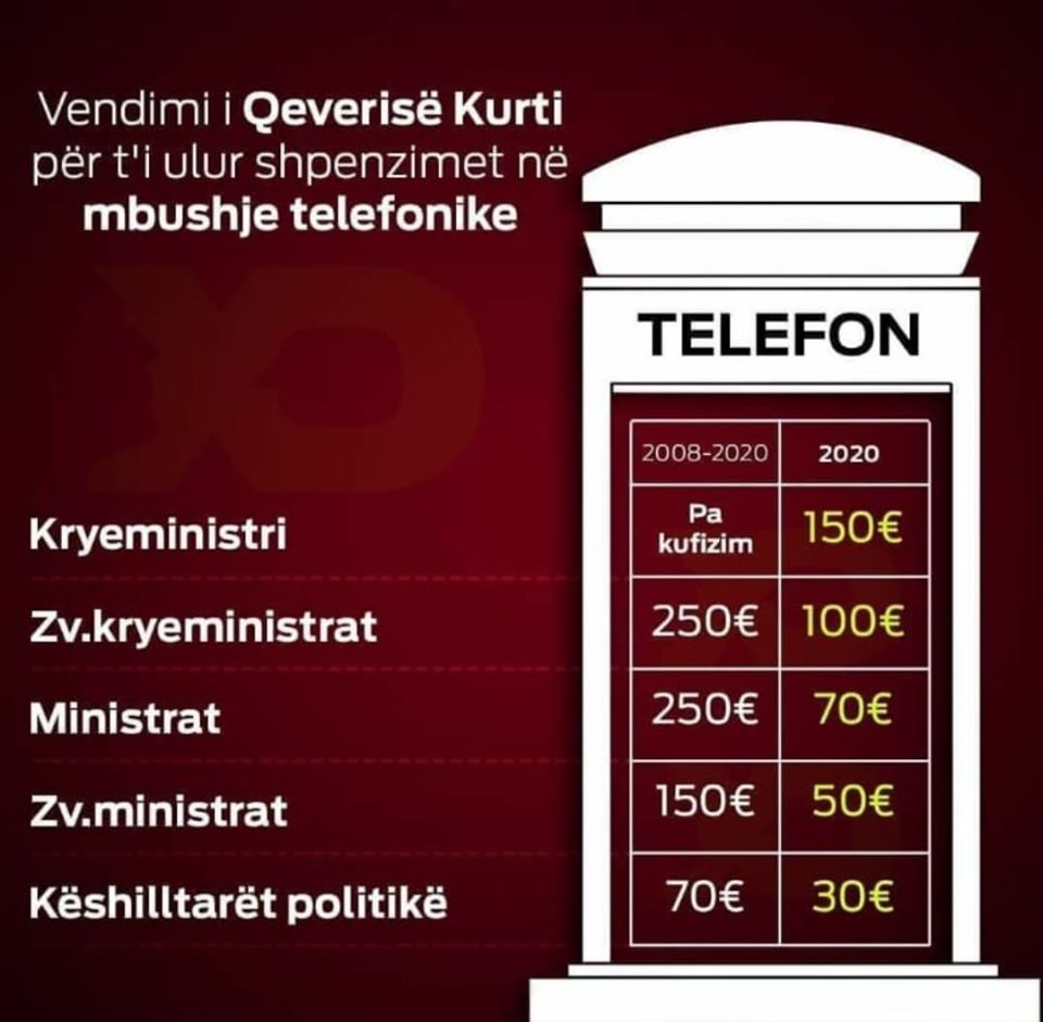 Kësisoj nga 2008 deri më 2020 parashihej që kryeministri të kishte shpenzime në mbushje telefonike pa kufizim, kurse tani i caktohet shifra prej 150 eurove, raporton Indeksonline.