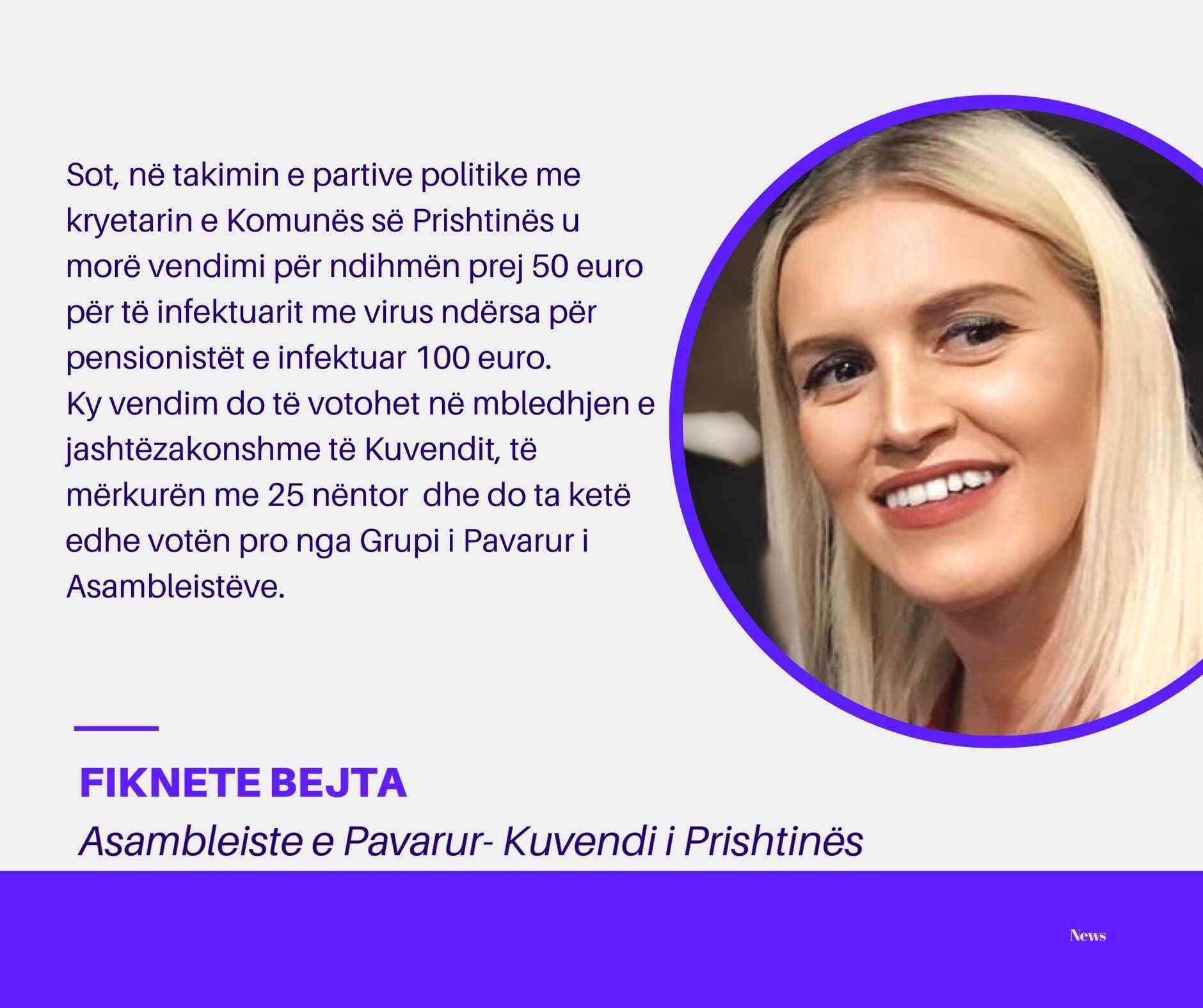 Kryetari i Komunës së Prishtinës, Shpend Ahmeti së fundmi ka propozuar që secilit qytetar të Prishtinës që ka qenë i infektuar me koronavirus, t’i jepet nga 50 euro.