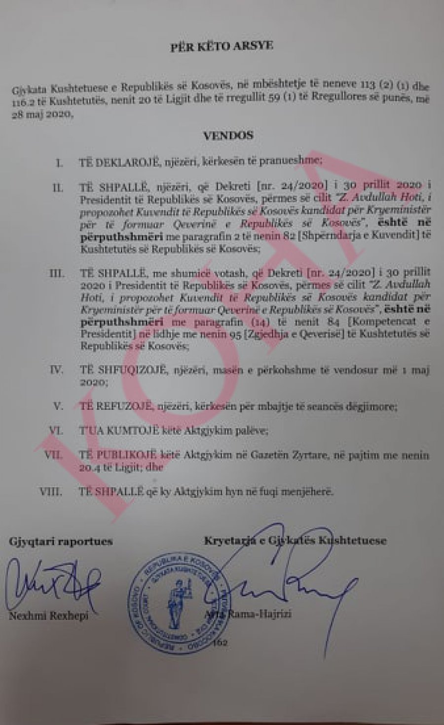 Kushtetuesja ditë më parë vendosi në favor të dekretit të presidentit, ndërkohë sot në konstatimet e saj, në pikën 2, thuhet se “Vendos të shpallë njëzëri që dekreti (nr. 24/2020) i 30 prillit i Presidentit të Republikës së Kosovës përmes së cilit ‘Z. Avdullah Hoti, i propozohet Kuvendit të Republikës së Kosovës kandidat për kryeministër për të formuar Qeverinë e Republikës së Kosovës’, është në përputhshmëri me paragrafin 2 të nenit 82 (shpërndarje e Kuvendit) të Kushtetutës së Kosovës”.