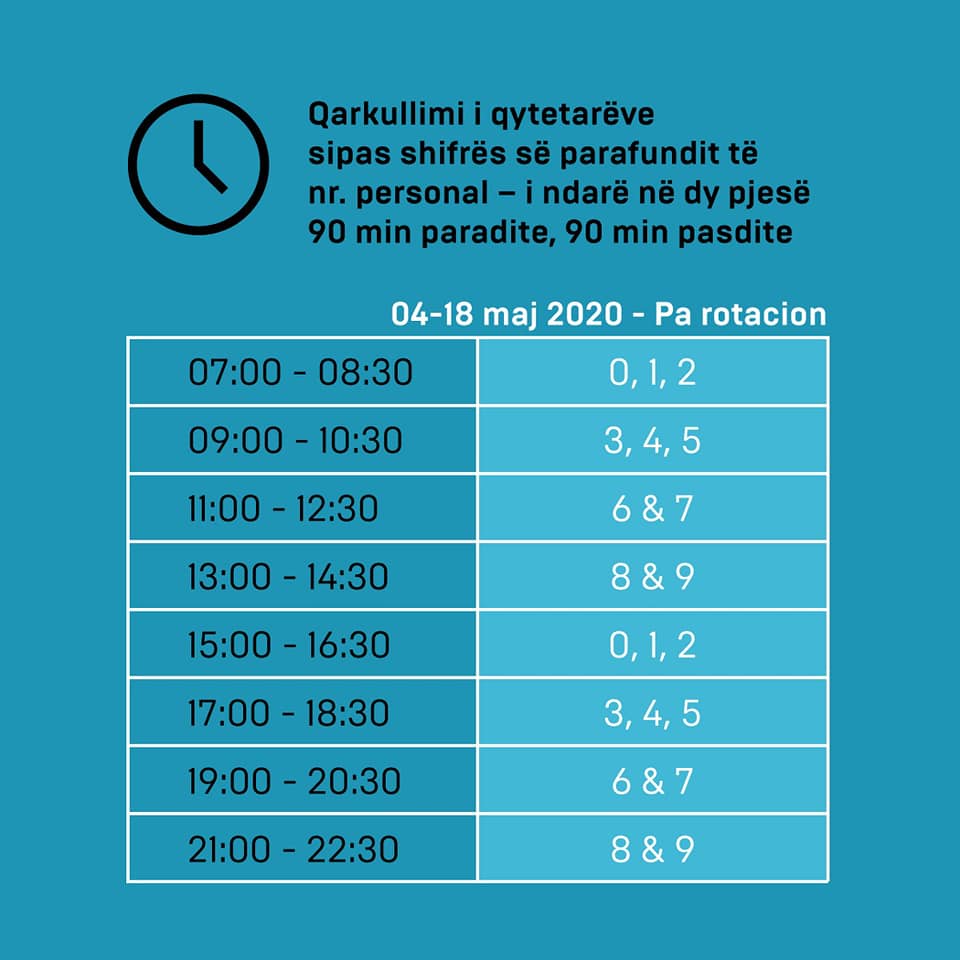 Ministri i Shëndetësisë, Arben Vitia ka njoftuar se nuk do të ketë më rotacion të orarit por nga nesër qytetarët do të dalin dy herë nga 90 minuta, para dhe pas dite.
