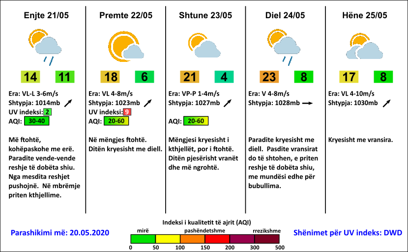 21.05 – Më ftohtë, kohë pas kohe me erë. Paradite vende-vende reshje të dobëta shiu. Nga mesdita reshjet pushojnë. Në mbrëmje priten kthjellime.