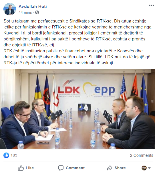 Nënkryetari i LDK’së, Avdullah Hoti, përmes një postimi në llogarinë e tij në Facebook ka thënë se Radio Televizioni i Kosovës, nuk do t’i takojë individëve por qytetarëve të Kosovës nga të cilët edhe financohet.