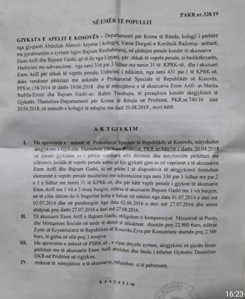 Arifi është dënuar për veprën penale “Mashtrim me subvencione”.
