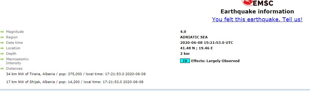 Një tjetër lëkundje tërmeti është regjistruar pak çaste më parë në Tiranë. Qendra Evropiane e Tërmeteve (ESCM) raporton se tërmeti ka qenë me magnitudë 4 të shkallës rihter.