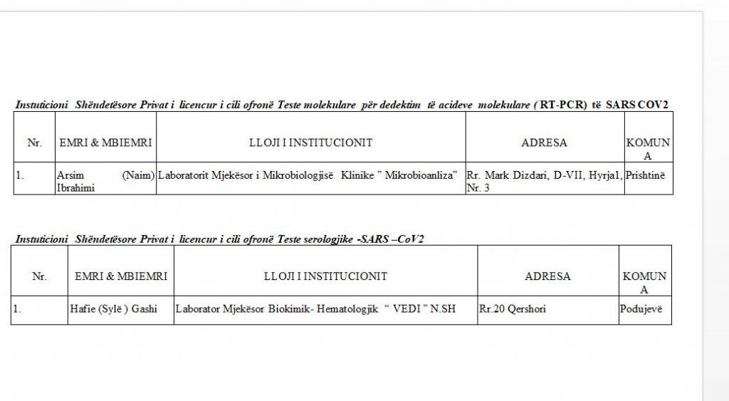 Gjeni bashkëlidhur listën e institucioneve të tjera shëndetësore private të cilat kanë marrë lejen për kryerje të testimeve moleklulare (PCR) dhe serologjike për SARS COV 2 (Covid-19)