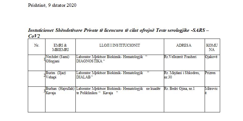 Ministria e Shëndetësisë në Kosovë ka licencuar edhe tri institucione private shëndetësore për të kryer testime për Covid 19 me metodën e testimit serologjik.