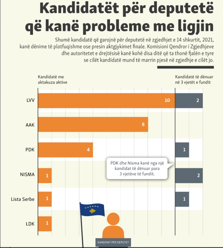 Në një grafikë të publikuar nga Radio Evropa e Lirë, bëhet e ditur se Lëvizja Vetëvendosje ka 10 kandidatë me aktakuza aktive dhe 2 të dënuar në tri vitet e fundit.