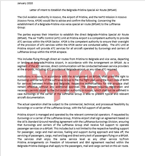 Përfaqëuesi i kompanisë gjermane  Lufthansa dhe Euroëings ka nënshkruar me zyrtarë nga Kosova e e Serbia letrën e qëllimit (dokumente të ndara), për të vendosur korridor të veçantë ajror për fluturime në dy kryeqytetet. Gazeta Express e ka siguruar të plotë dokumentin që obligon Kosovën të heq taksën ndaj Serbisë të vendosur nga Kryeministri Haradinaj në nëntor të vitit 2018.
