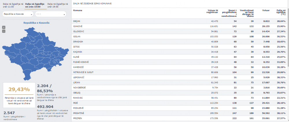 Dalja e përgjithshme deri në orën 15:00 kanë dalë është mbi 29 për qind nga totali i përgjithshëm gjithmonë bazuar në të dhënat e dërguara në KQZ.