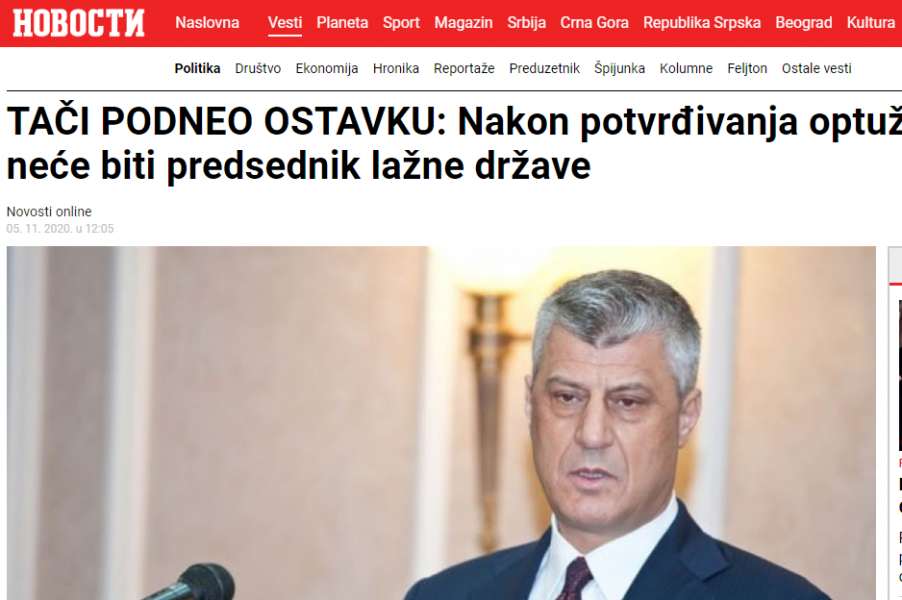 Mediumi serb ‘Novosti’ që njihet për afërsi dhe propagandë në shërbim të ish-ministrit të Informacionit të Sllobodan Millosheviqit ka raportuar pasi presidentit të Kosovës i është konfirmuar aktakuza nga Specialja.