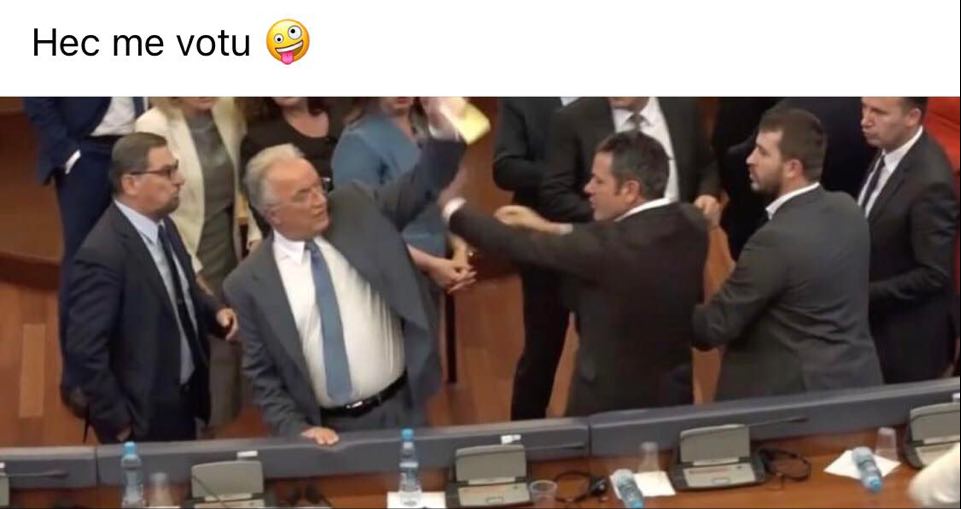 Për të bërë shaka me tërë këtë situatë, është përdorur edhe një fotografi nga momenti i kavafytjes në Kuvend ndërmjet Xhavit Halitit dhe deputetit të LDK-së Arben Gashi.