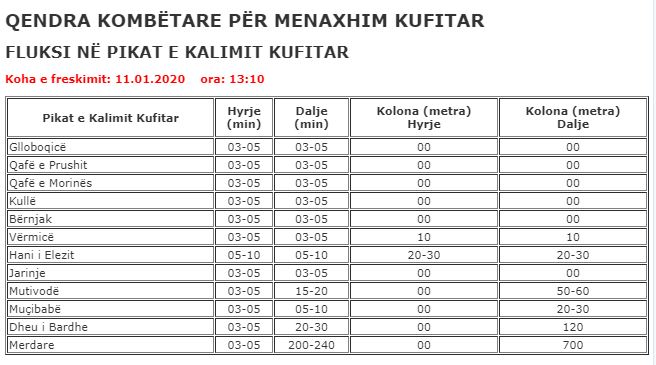 Sipas të dhënave të Qendrës Kombëtare për Menaxhim Kufitar, të përditësuara sot në orën 13:00, në pikën e kalimit kufitar në Merdare po pritet deri në katër orë, kurse kolona e automjeteve është e gjatë rreth 700 metra.