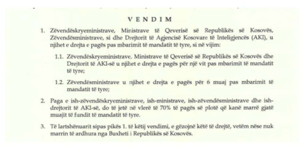 Vendimi për përfitimin pas mandatit thotë se ministrat marrin 70 për qind të pagës një vit pasi ta përfundojnë mandatin, ndërsa zv.ministrat paguhen për gjashtë muaj të tjerë me 70 për qindëshin e pagës së tyre.