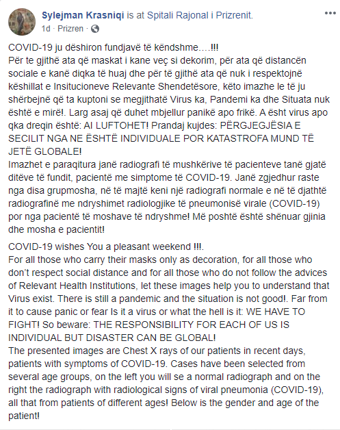 Krasniqi më anë të një shkrimi në Facebook, thotë se virusi COVID-19 ekziston dhe se situata nuk është e mirë.