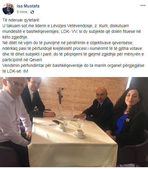 Kryetari i LDK-së, Isa Mustafa përmes një fotografie në Facebook të takimit që ky i fundit së bashku me kandidaten për Kryeministre Vjosa Osmani kanë pasur me Kryetarin e Lëvizjes Vetëvendosje Albin Kurti dhe nënkryetarin Besnik Bislimi.