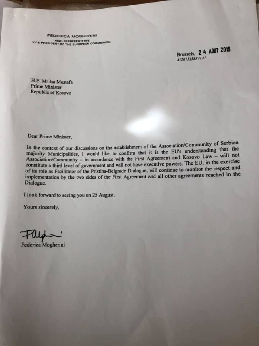 Kreu i Lidhjes Demokratike të Kosovës, Isa Mustafa, ka zbuluar një letër që e kishte marrë më 24 gusht 2015, një ditë para nënshkrimit të Marrëveshjes mbi Parimet e Përgjithshme të Asociacionit, nga tashmë ish-Përfaqësuesja e Lartë e BE-së, Frederica Mogherini, ku ishte siguruar se Asociacioni i komunave me shumicë serbe nuk do të ketë kompetenca ekzekutive.
