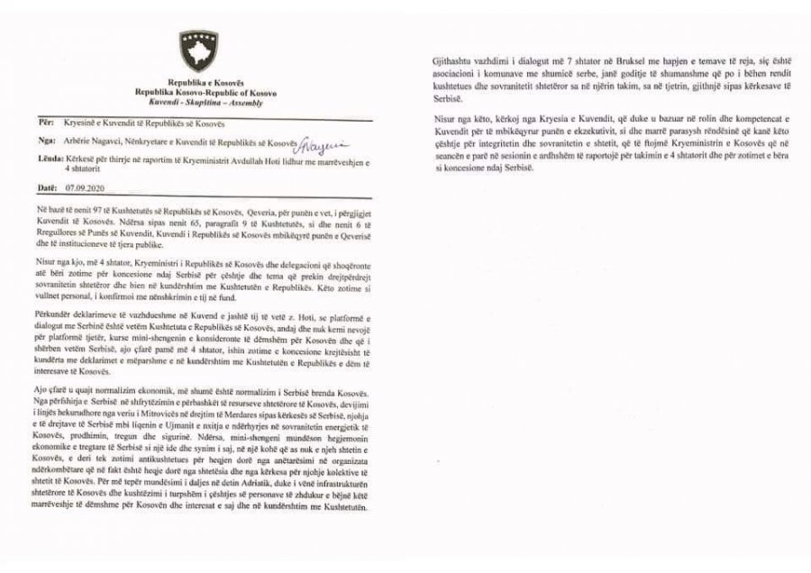 Nënkryetarja e Kuvendit, Arbërie Nagavci, ka kërkuar nga Kryesia e Kuvendit që ta ftojë në raportim kryeministrin Avdullah Hoti, lidhur me marrëveshjen e nënshkruar në SHBA.