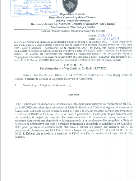 Ministrja e Arsimit dhe Shkencës, Arbërije Nagavci, e ka shkarkuar anëtarin e bordit të Këshillit Shtetëror të Cilësisë, Binak Beqaj.
