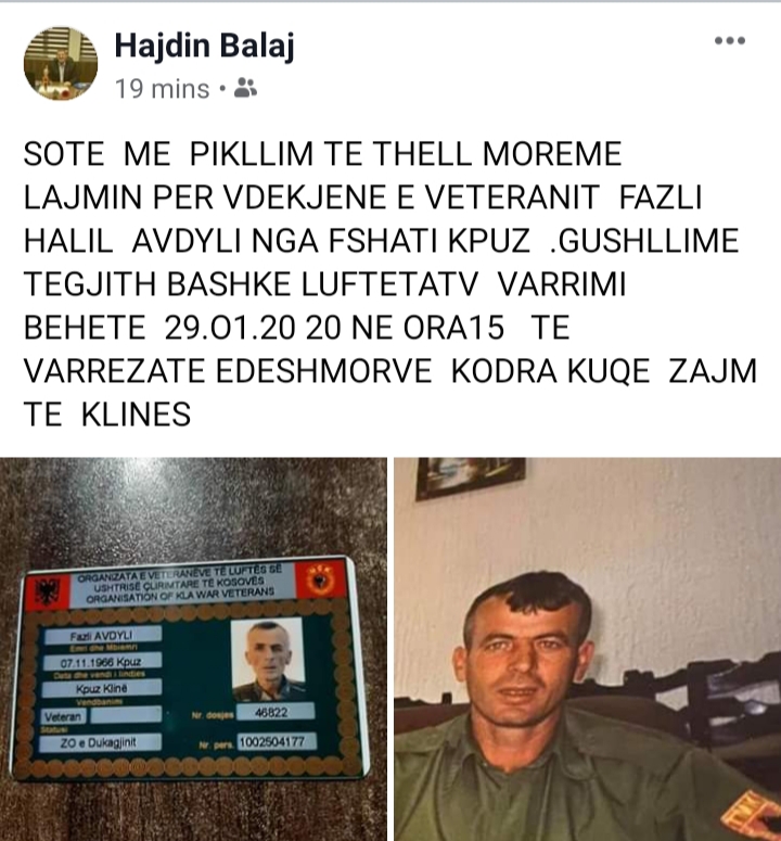 Varrimi i të ndjerit bëhet sot më 29.01.2020, ora 15:00, te varrezat e dëshmorëve “Kodra e Kuqe” në Zajm të Klinës.