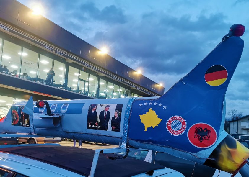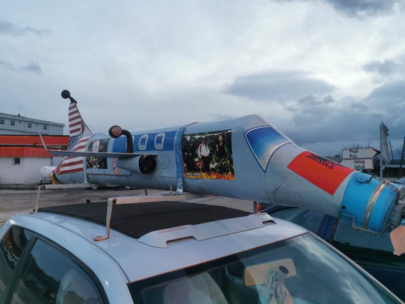 Në veturën e tij, mbi të cilën është ndërtuar një aeroplan, në të cilin i gjeni të gjitha simbolet që një shqiptar patriot dëshiron t’i shohë, e gjejmë: flamurin kombëtar, flamurin shtetëror të Kosovës, flamurin Dardan, flamurin amerikan, flamurin gjerman, Ibrahim Rugovën, Bill Clintonin, familjen Jashari dhe legjendën e futbollit kosovar, Fadil Vokrri.