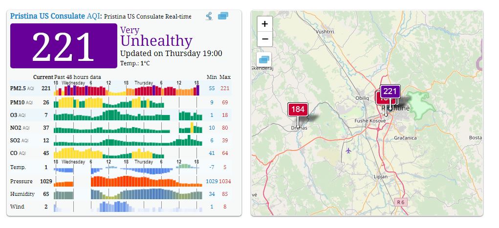 Në bazë të matësit të ambasadës amerikane në kryeqytet, ndotja e ajrit në ora 19:00, ka arritur shkallën prej 221.