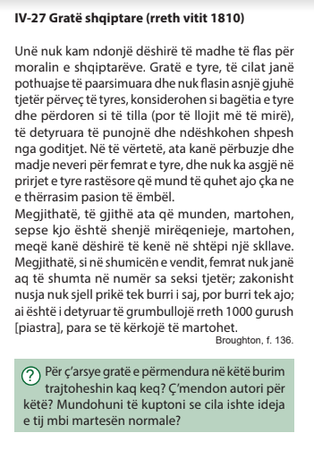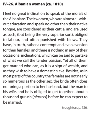 Përpos që shkruhet se gratë shqiptare konsiderohen si bagëti, aty shkruhet se burrat kanë përbuzje dhe neveri për femrat e tyre, por ata që munden, martohen.