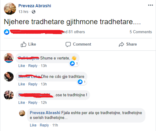 Komentet nuk kanë qenë të pakta, e gjithashtu as përkrahja përmes “like”. Madje, ndër ta ka edhe deputetë të partive të tjera. Valdete Idrizi e PDK-së dhe Jahja Kokaj i VV-së e kanë pëlqyer postimin ku Osmani quhet tradhtare.