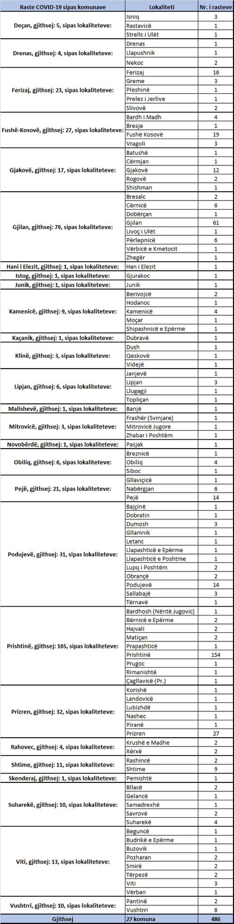 Rastet pozitive janë nga komuna Prishtinë 165 raste, komuna Gjilan 79 raste, komuna Prizren 32 raste, komuna Podujevë 31 raste, komuna Fushë Kosovë 27 raste, komuna Ferizaj 23 raste, komuna Pejë 21 raste, komuna Gjakovë 17 raste, komuna Viti 13 raste, komuna Shtime 11 raste, komuna Suharekë 10 raste, komuna Vushtrri 10 raste, komuna Kamenicë 9 raste, komuna Lipjan 6 raste, komuna Obiliq 6 raste, komuna Deçan 5 raste, komuna Drenas 4 raste, komuna Rahovec 4 raste, komuna Klinë 3 raste, komuna Mitrovicë 3 raste dhe me nga një rast komunat Hani i Elezit, Istog, Junik, Kaçanik, Malishevë, Novobërdë dhe Skenderaj.